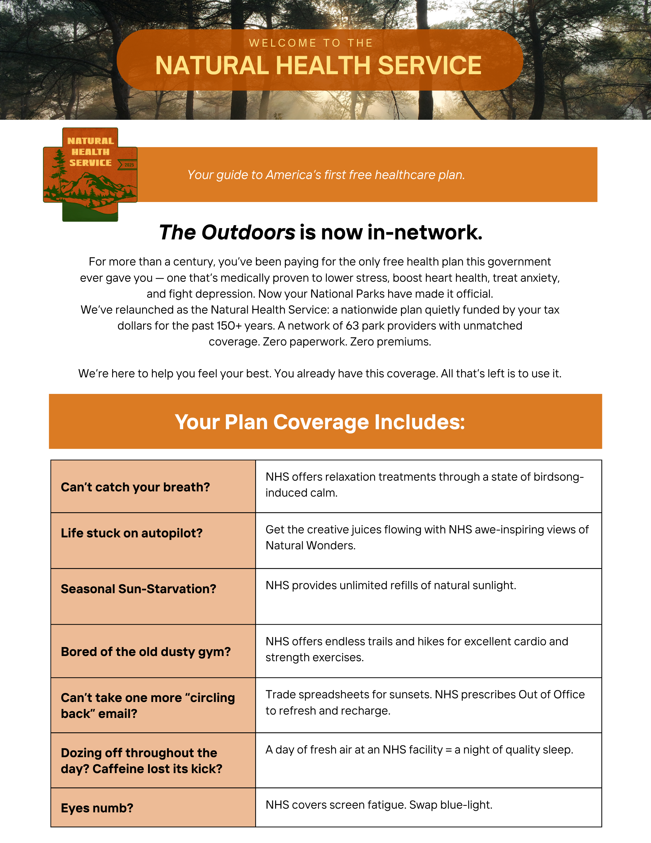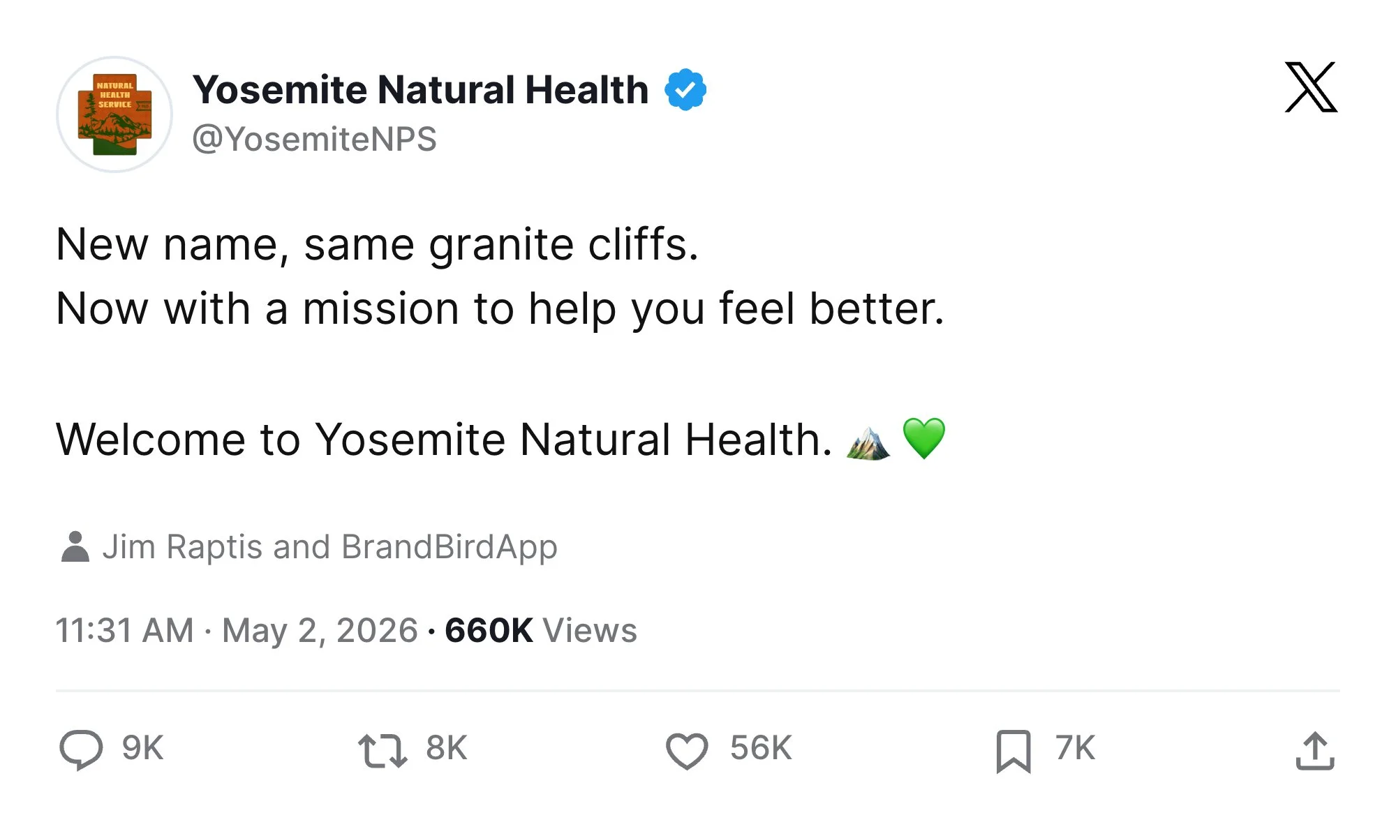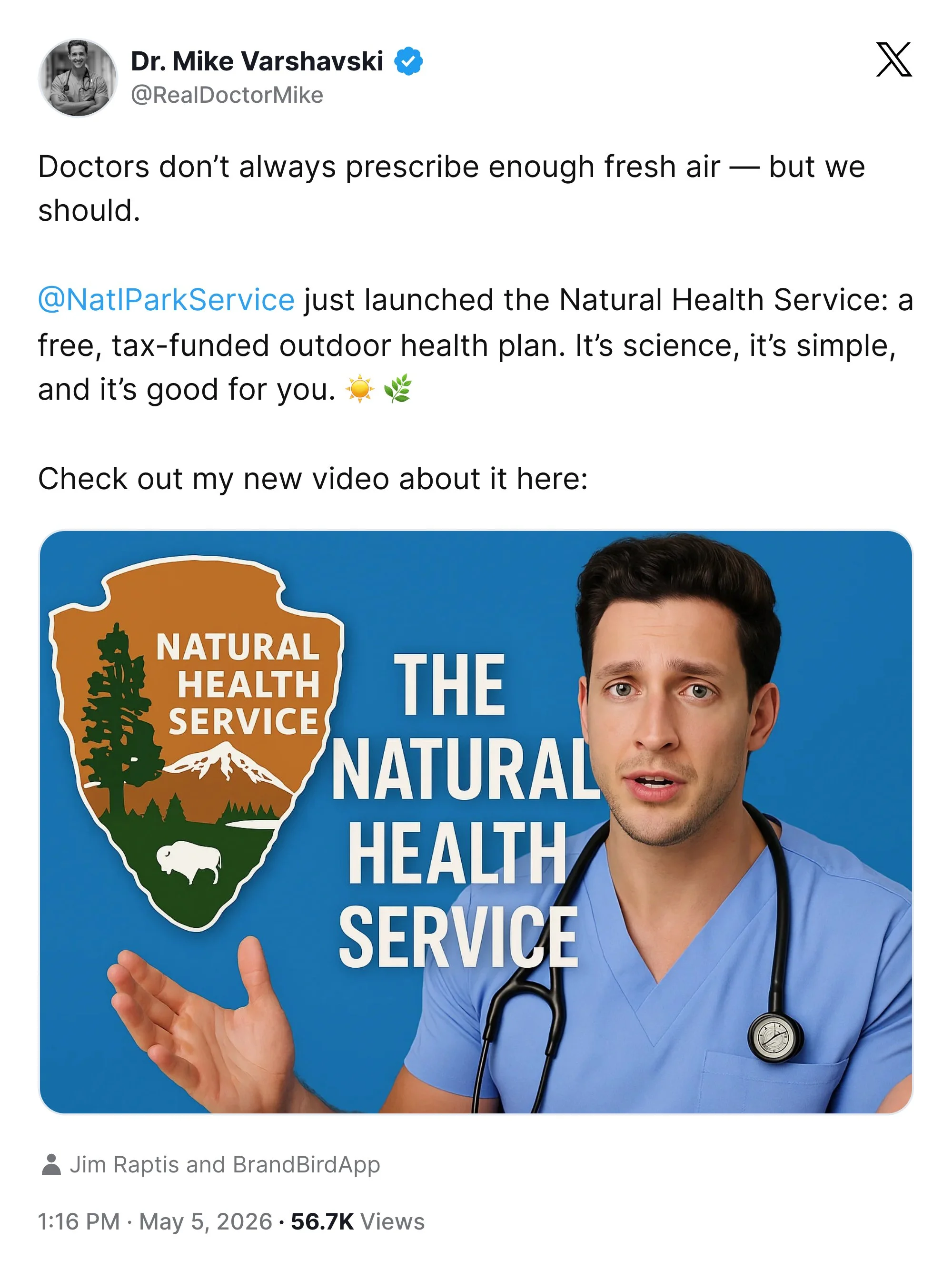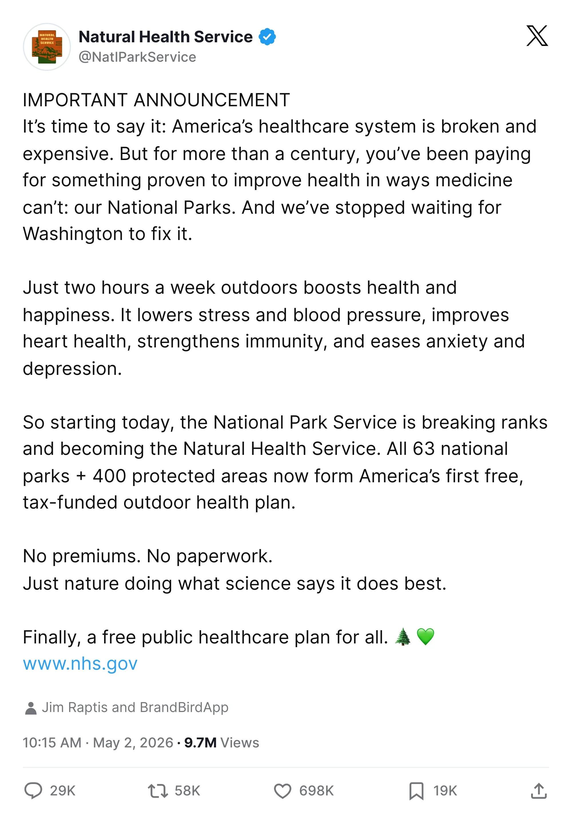 Launched an X/Twitter takeover to announce the National Park Service’s rebrand as the Natural Health Service — America’s first free healthcare system,