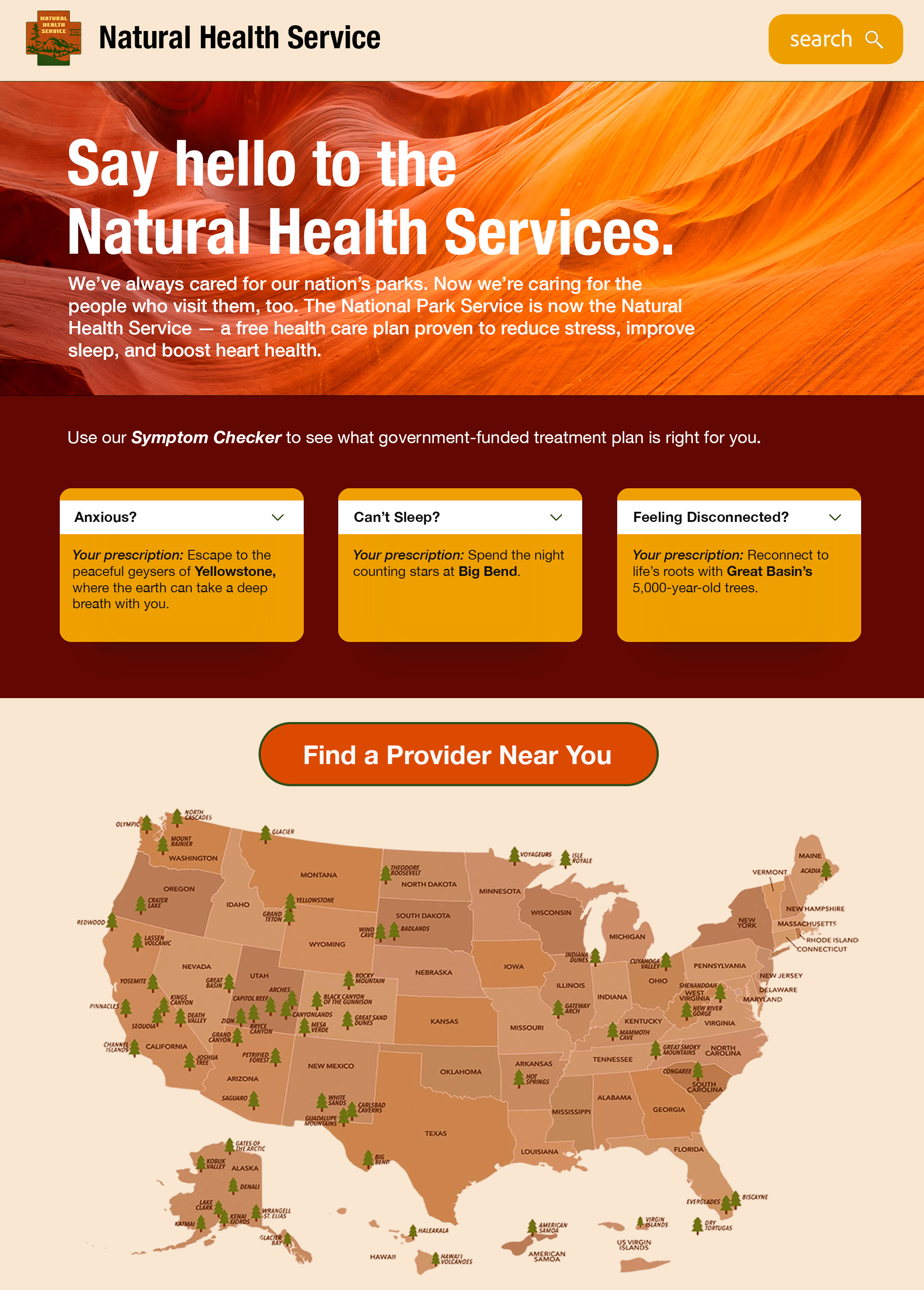 Rebranded the official NPS website as the Natural Health Service. Complete with a Symptom Checker and ‘Find a Provider’ map.