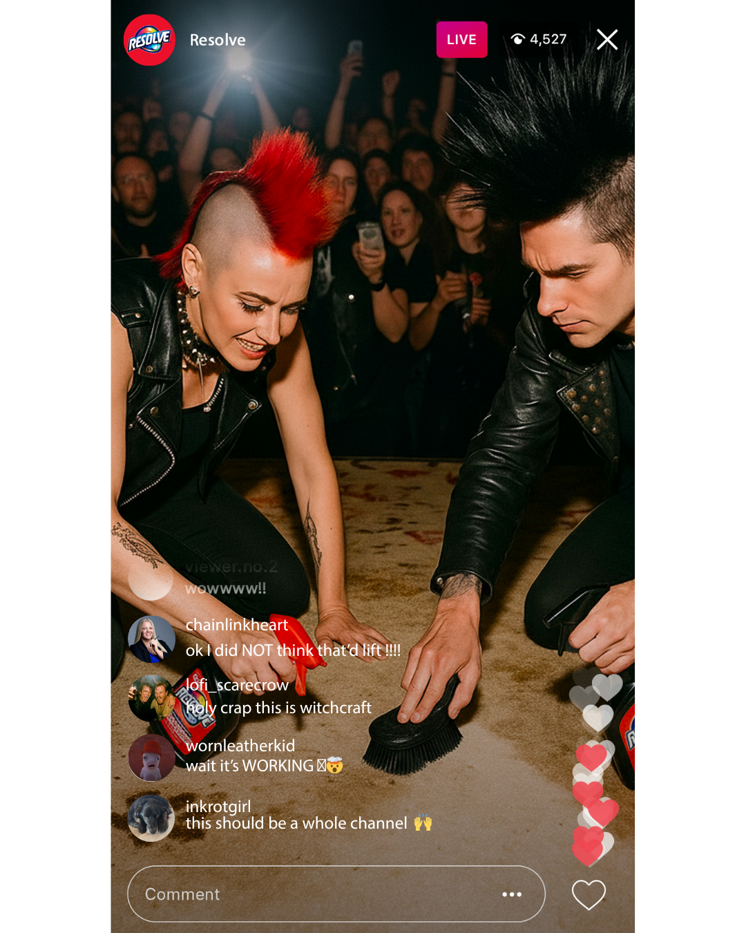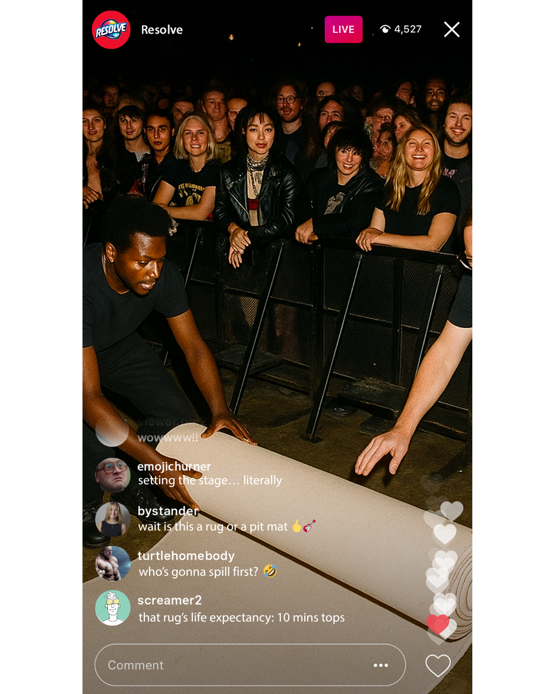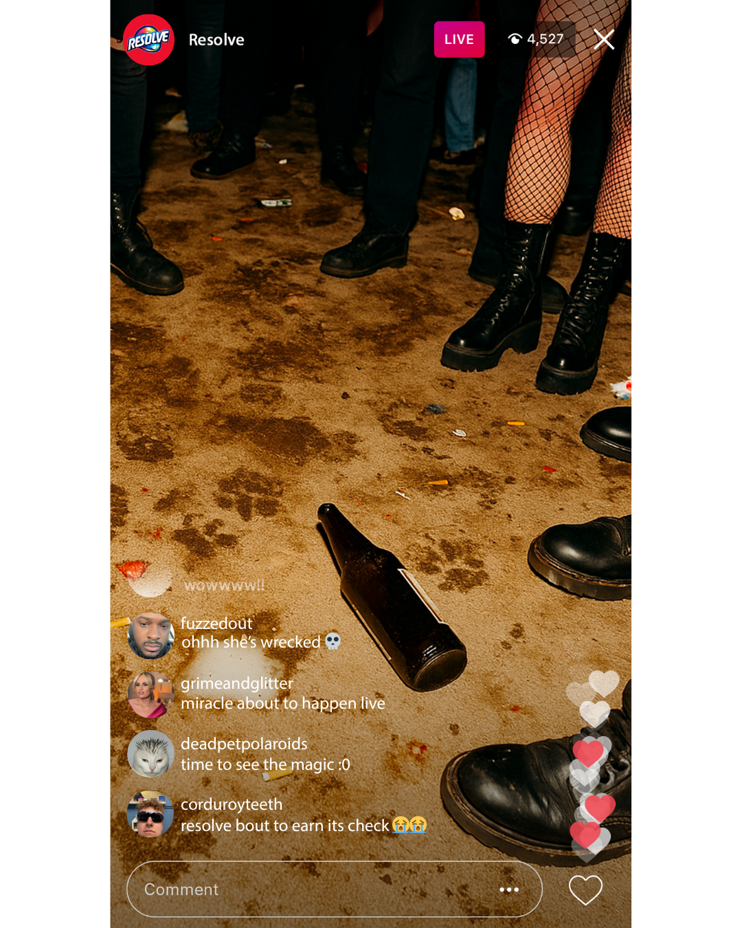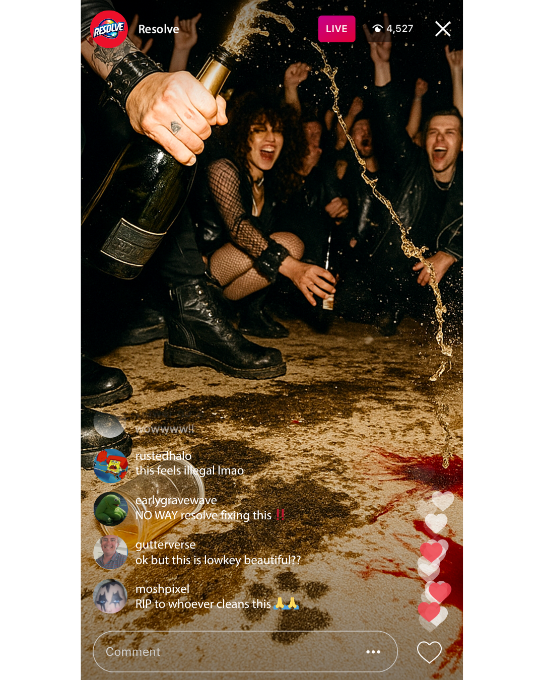 By the end of the night, the rug is trashed. Perfect. Because that’s when Resolve takes the stage. Our crew cleans the entire thing LIVE on Instagram + TikTok, transforming it from disaster back to pristine. The before-and-after becomes our mic drop: proof that life’s chaos is nothing to fear when you’ve got Resolve.